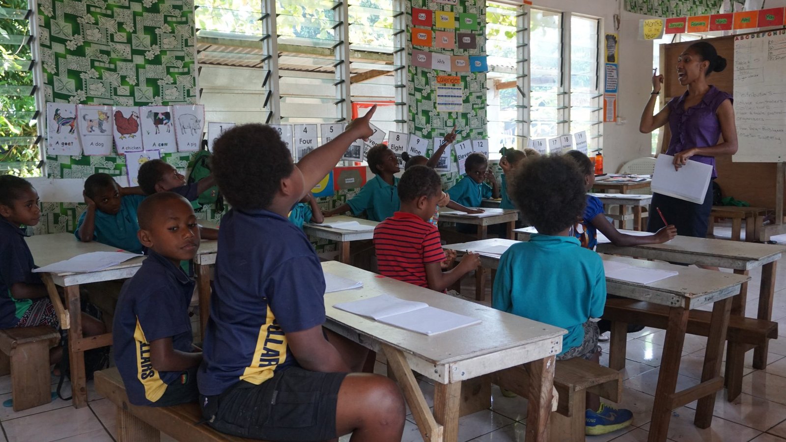 school children with hands up!